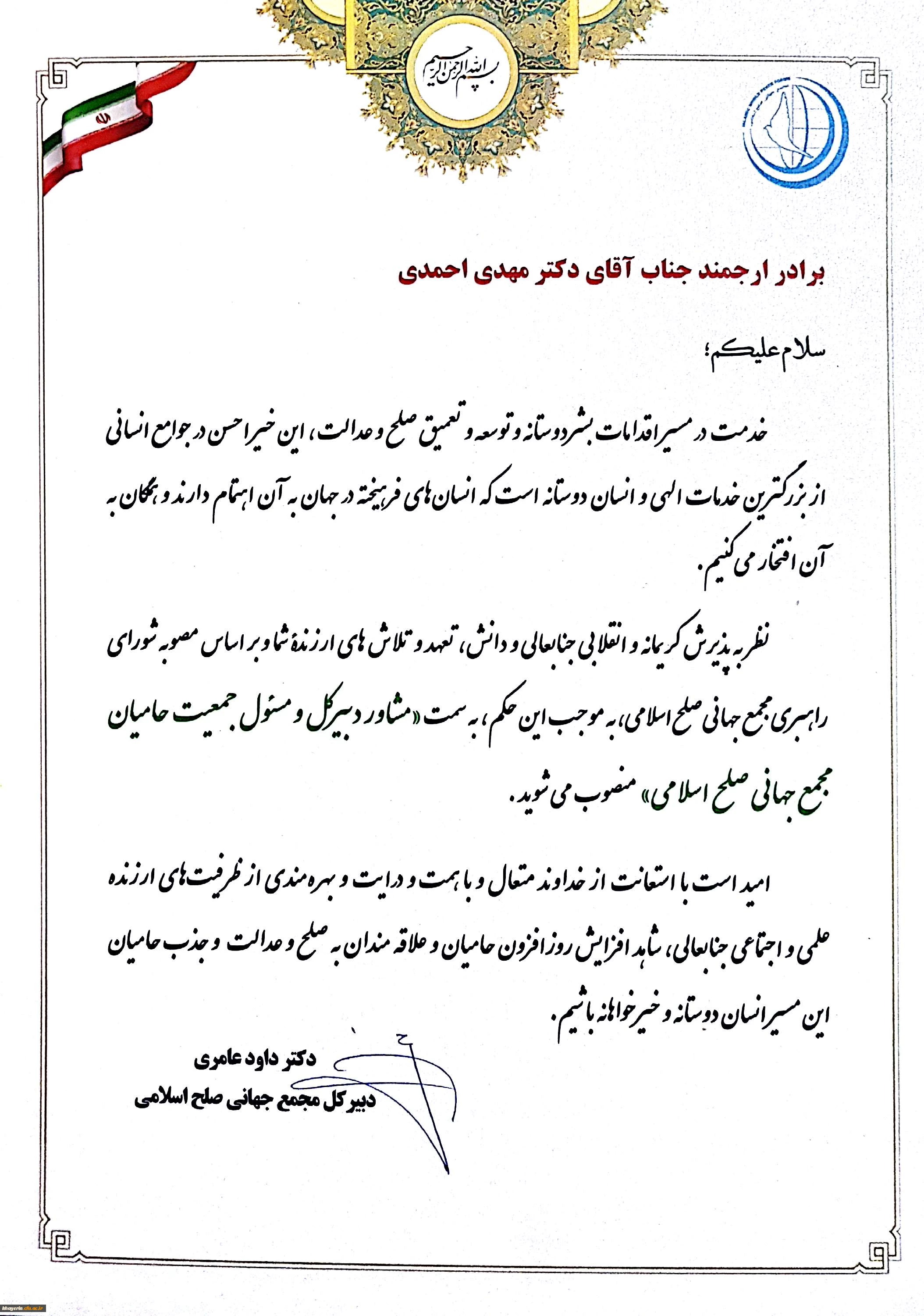 دریافت حکم مشاور دبیر کل مجمع جهانی صلح اسلامی 2